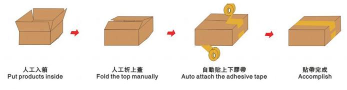 1.本系列是以单机机型,上下“一”字型贴膜带多规格化全自动封箱机包装作业