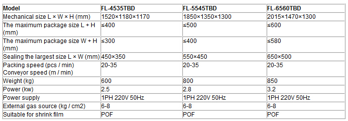 · FL-5545TBD is our company developed a fully automated unmanned operation of "L" type sealer is widely used in high-volume packaging assembly line, automatic feeding, conveying, into the bag, sealing, shrink once of complete, high working efficiency, especially for the larger sizes of products higher· Sealing part of the vertical drive. Seal contact surface evenly. Vertical drive can overcome the traditional "L" type automatic packing machine sealing and cutting problems arise wrinkles and sealing products are not the middle of the line. Achieve excellent sealing effect